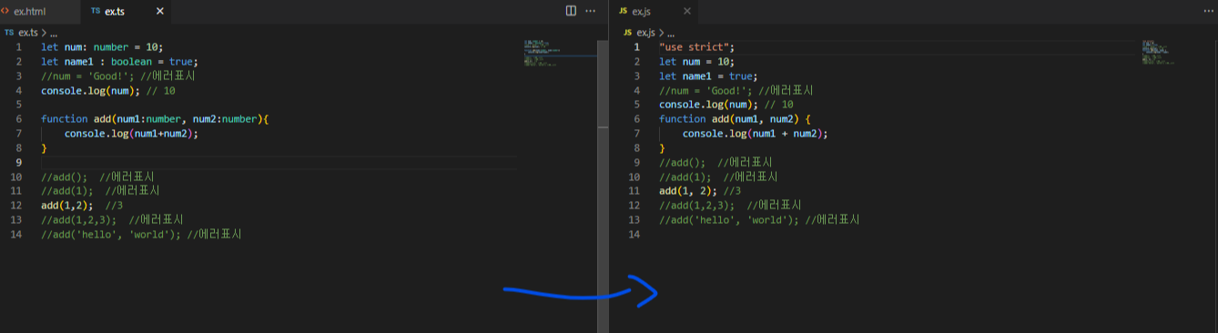 - ts 파일을 생성하고 TypeScript를 코딩한다 예) ex.ts
