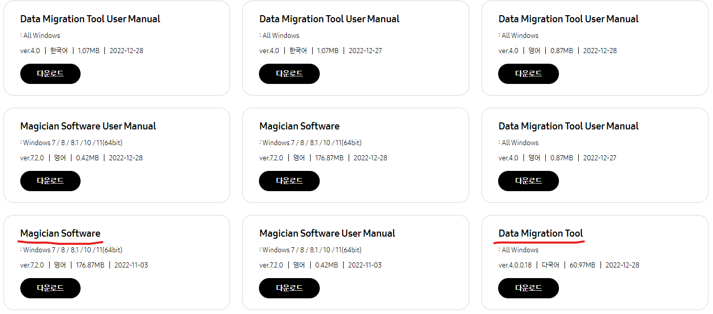 삼성전자 공식홈페이지에서 내가 구매한 SSD 카드 이름을 입력하고 메뉴얼 탭으로 넘어가면 다운로드 받을 수 있다.