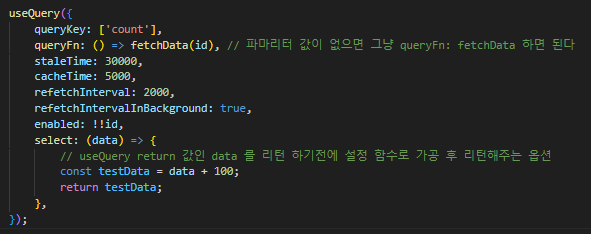 select 옵션은 useQuery 의 경우 많은 리턴값 중에 data 값을 반환하기 전에 설정한 함수로 가공하고 리턴해주는 옵션이다.