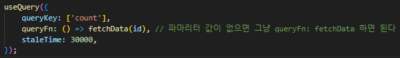 두번째 필수 옵션으로 queryFn 이 있는데 쉽게 말하면 여기서 데이터 패칭하는 함수를 쓰라는 소리다.